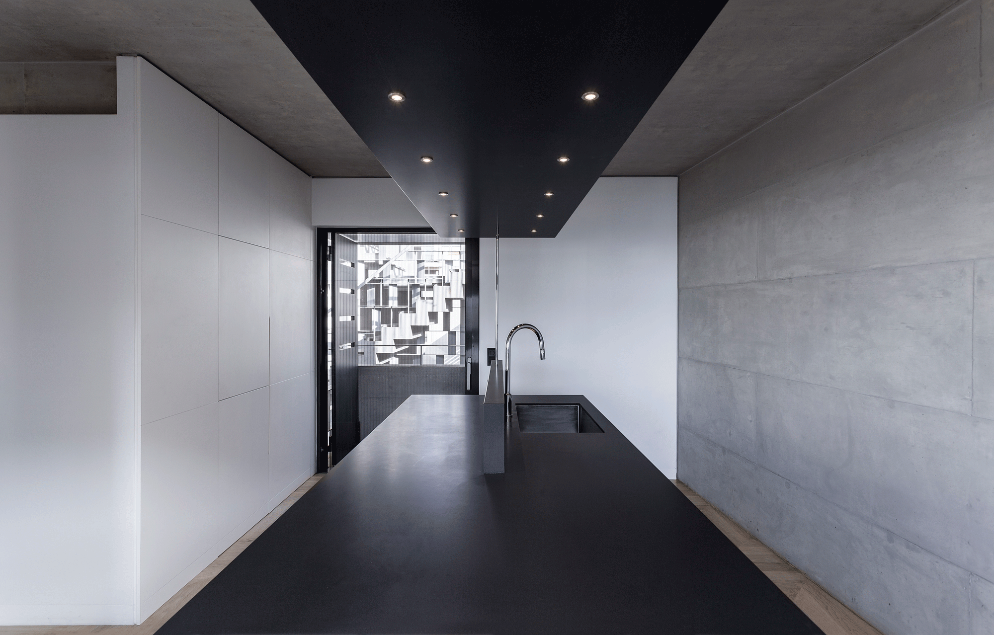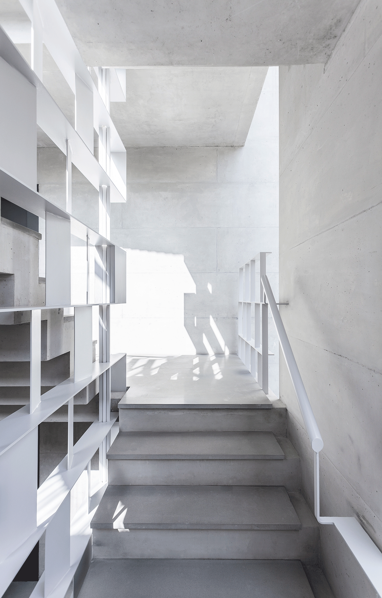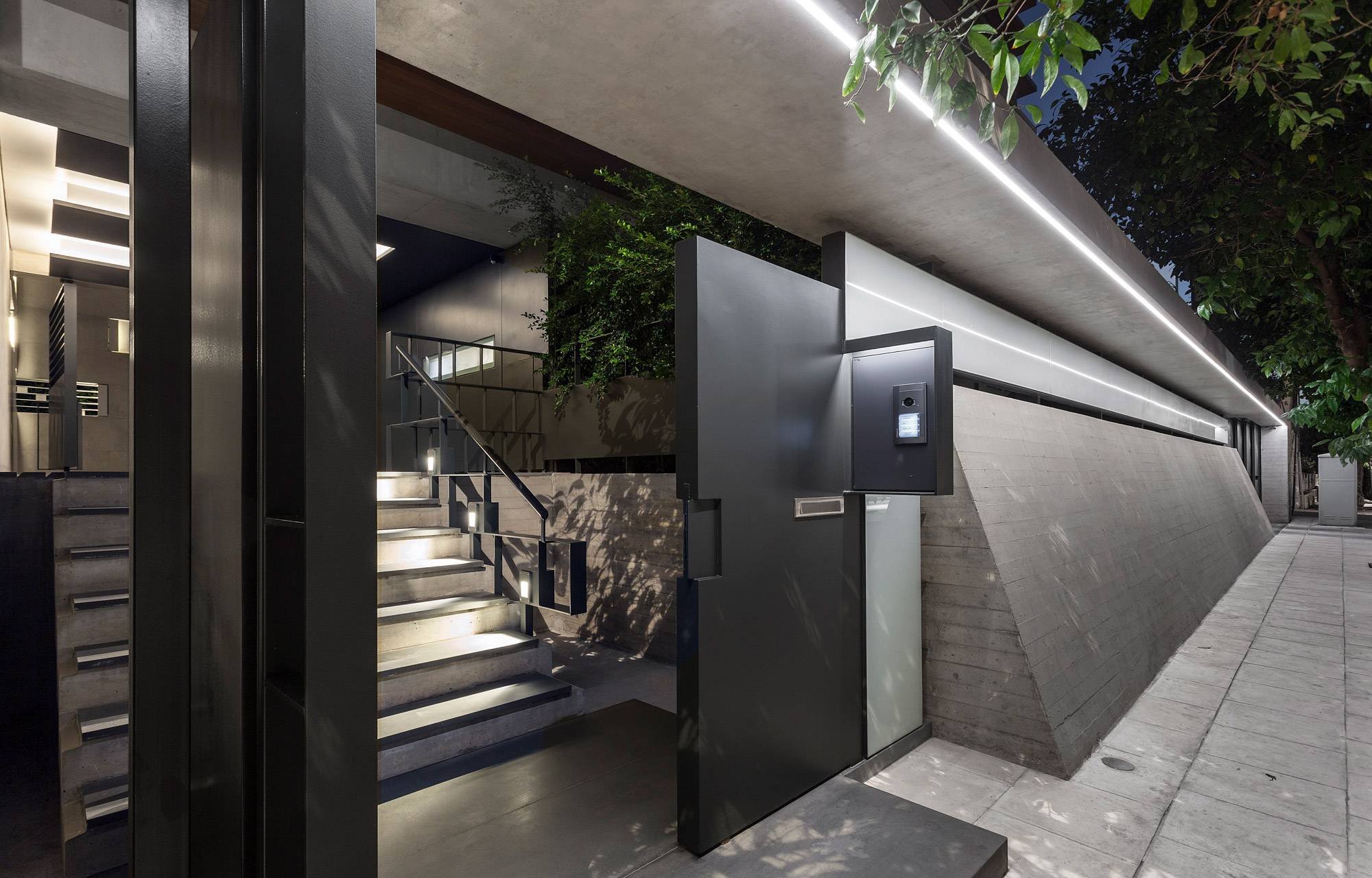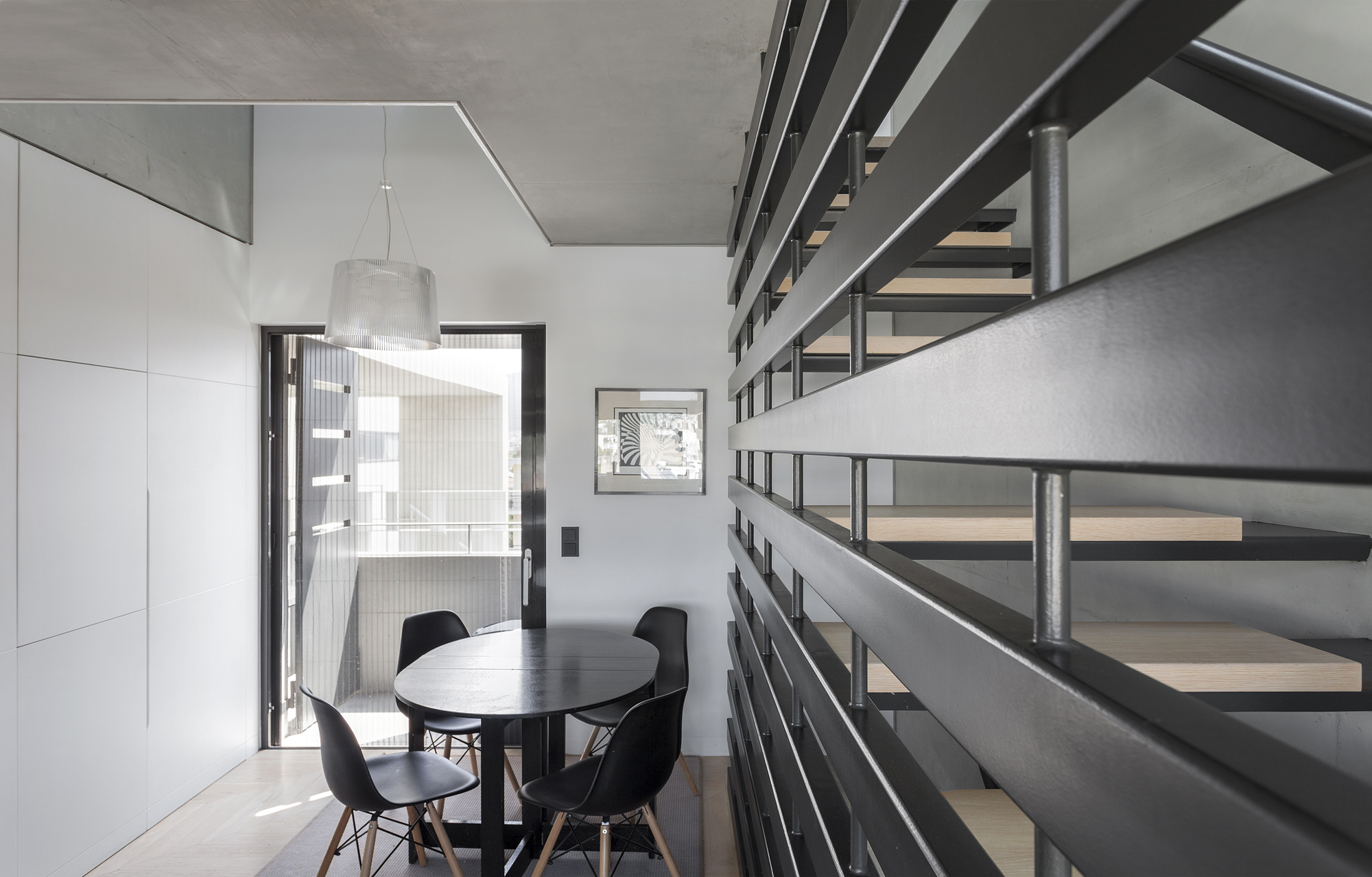 The building, designed by Nikos Ktenàs Architecture, through its structure, deals with the reinvention of the typology of the ‘polykatoikia’ – block of flats, where the unoccupied space of the lot, is proposed as an open air central entry hall, as well as a transitional space between the city and the living quarters. It is a stop, but at the same time a point of variation of the visitor’s course, from horizontal to vertical, from public to private. This interpretation of the unoccupied space of the urban building block gives it a substantial and inseparable spatial function in the building, in the classical sense that of the atrium where, through this space, the visitor enters the living spaces that surround it, which in turn, are projected towards the city, completing the exterior of the building block.